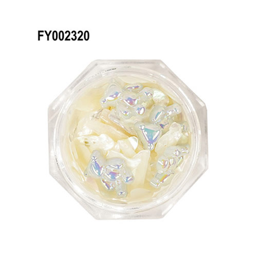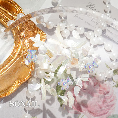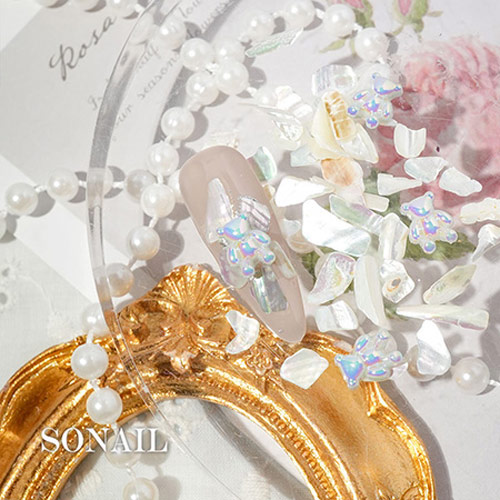 柔らかな光を纒うホワイトシェルとブルーオーロラのくまパーツをミックスさせた遊び心あるアイテム。淡いブルーなのでシアーなネイルデザインとも相性がいいです。