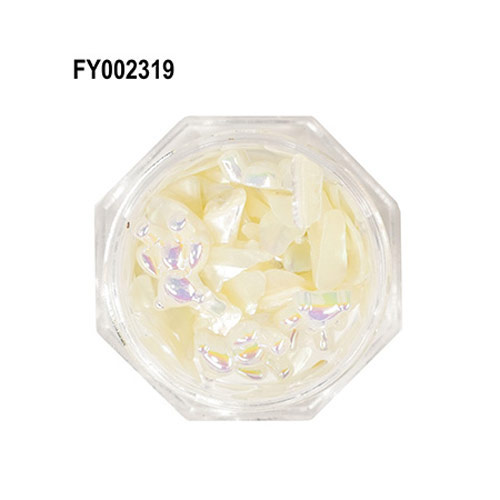 柔らかな光を纒うホワイトシェルと同色のオーロラくまパーツをミックスさせた遊び心あるアイテム。ニュアンスネイルのアクセントパーツとしておすすめ。